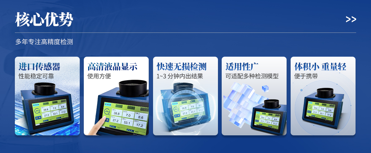| ◆ 進(jìn)口核心檢測(cè)傳感器,性能穩(wěn)定可靠; | ◆ 快速無(wú)損檢測(cè),1~3 分鐘內(nèi)出結(jié)果; | ◆ 10 吋觸屏操作簡(jiǎn)單,使用方便; | ◆ 適用性廣,可適配多種檢測(cè)模型; | ◆ 支持客戶自建模型; | ◆ 體積小、重量輕,便于攜帶; |