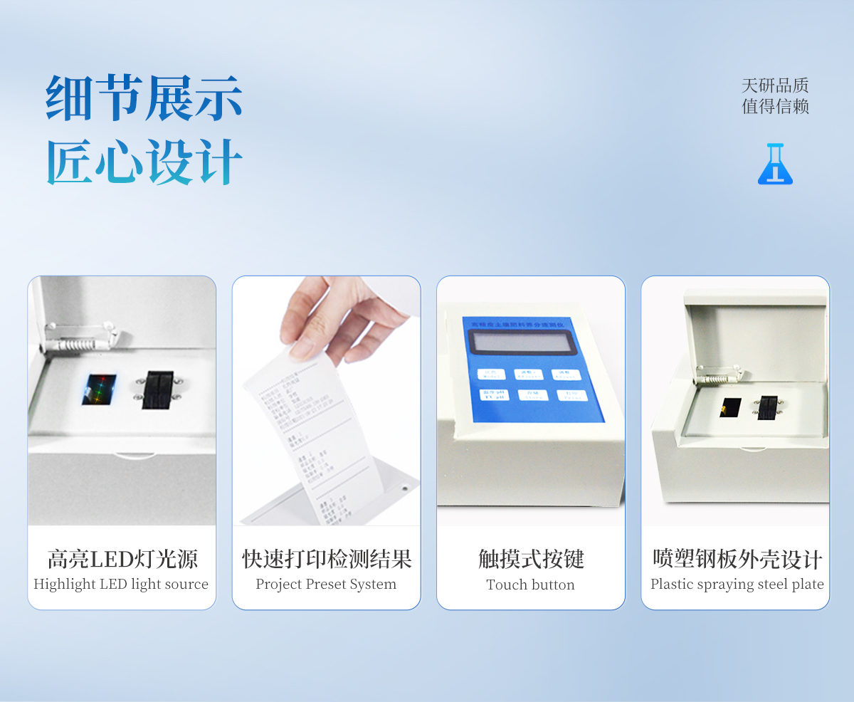 | 性能可靠,工作穩(wěn)定性均優(yōu)于國家標(biāo)準(zhǔn)JJG79-90標(biāo)準(zhǔn)5--6倍,重復(fù)性達(dá)到光柵類分光光度計(jì)指標(biāo),采用微處理器技術(shù),單片機(jī)控制,觸摸按鍵,操作簡便。 | 重金屬測試采用聯(lián)合消化和分項(xiàng)測試技術(shù),簡化測試流程,減少測試時(shí)間,大大提高測試效率,提高測試精度。 | 擴(kuò)展性強(qiáng),該儀不僅可以專用于重金屬的檢測還可以擴(kuò)展測定土壤、肥料、植株中養(yǎng)分的測試(HM-ZSA型),一機(jī)多用。 | 土壤重金屬檢測儀集藥,器,儀于一體,相當(dāng)于一個(gè)小型實(shí)驗(yàn)室, 兩個(gè)鋁合金箱體,易于攜帶,便于現(xiàn)場測試,流動(dòng)服務(wù)。適于基層檢測部門對含有重金屬污染的蔬菜、水果等食品進(jìn)行篩選。 |
