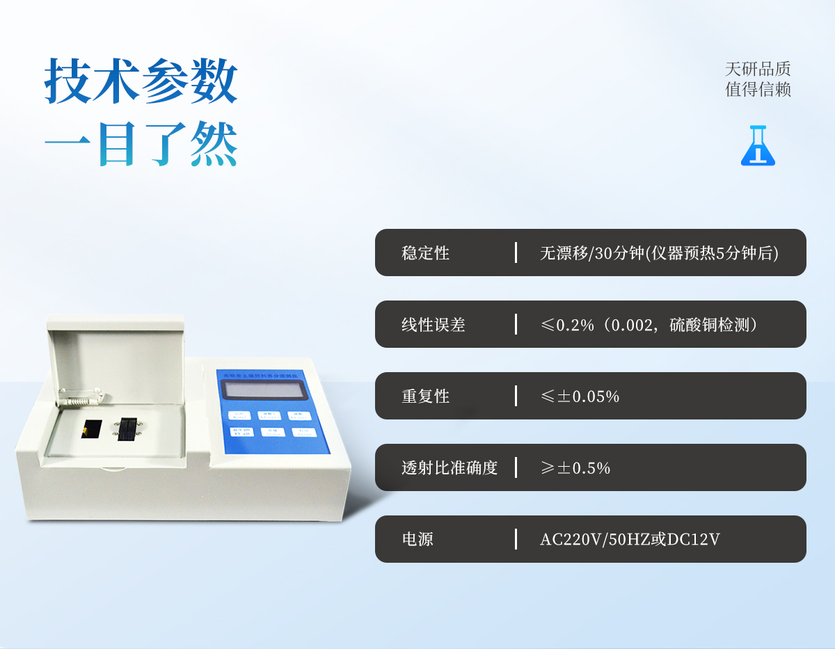 | 儀器透射比準(zhǔn)確度 ≥±0.5% | 儀器重復(fù)性 ≤±0.05% | 儀器穩(wěn)定性 無漂移/30分鐘(儀器預(yù)熱5分鐘后) | 線性誤差 ≤0.2%(0.002,硫酸銅檢測) | 儀器功耗 ≤5W | 電源 AC220V/50Hz或DC12V | 結(jié)果輸出 內(nèi)置**熱敏打印機(jī)可自動(dòng)打印出檢測結(jié)果,方便直觀。 |