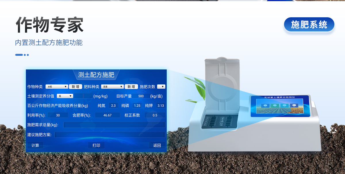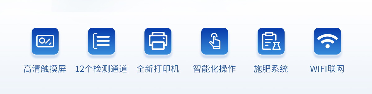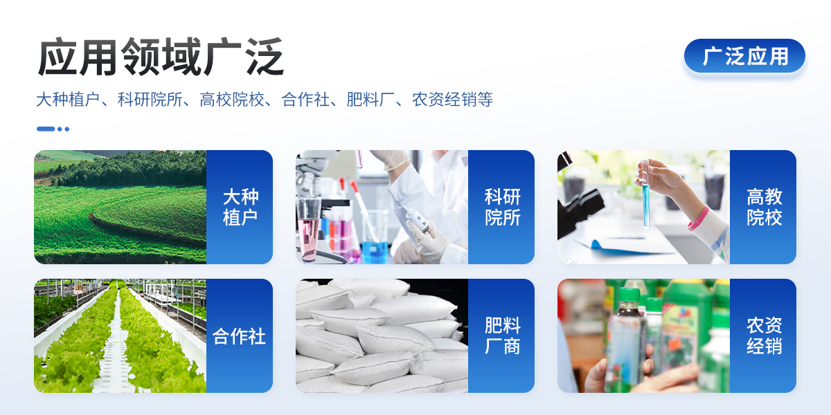 | 配套齊全:該儀器相當于一個小型實驗室,無需用戶自配附件。適于農(nóng)業(yè)服務部門或農(nóng)資經(jīng)銷商、合作社、肥料廠商、大種植戶測土施肥。 | 檢測功能全:測試項目國內(nèi)外全面,除標配試劑外,其他各類藥劑均可加配選購。 | 操作簡便、速度快捷,配套整套附件及成品藥劑開瓶即用,無須配置。 |