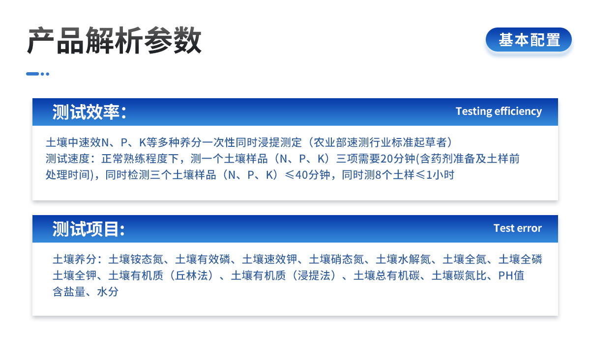| 土壤中速效N、P、K等多種養(yǎng)分一次性同時浸提測定(農(nóng)業(yè)部速測行業(yè)標準起草者)。 | 測試速度:正常熟練程度下,測一個土壤樣品(N、P、K)三項需要20分鐘(含藥劑準備及土樣前處理時間),同時檢測三個土壤樣品(N、P、K)≤40分鐘,同時測8個土樣≤1小時。 |