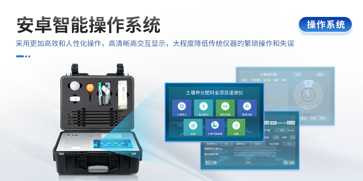 | 安卓智能操作系統(tǒng)Android 7.1版本,主控芯片采用ARM Cortex-A7,RK3288/4核處理器,主頻1.88Ghz,運轉(zhuǎn)速度更快速,穩(wěn)定性更強。 | 可檢測各種土壤、肥料、作物、食品、水質(zhì)、環(huán)境等共200多個測試項目,一機多用,功能齊全。 | 測試速度更快!無需空白對照和標準校準,省卻以往繁瑣的操作步驟,一鍵式操作,直接讀取數(shù)據(jù),**率,低消耗。 | 12個旋轉(zhuǎn)檢測通道,一次性可快速檢測12個樣品,極大提升檢測效率,降低檢測成本。 | 采用高精度濾光片技術(shù)自主**分析方法(**號:ZL 2020 2 1763837.9),**認證。 | 具有自身保護功能,內(nèi)置人臉識別攝像頭可掃臉登錄,也可設(shè)置用戶名和密碼,防止非工作人員操作查看實驗數(shù)據(jù)。 | 檢測過程中內(nèi)置校準功能,智能恒流穩(wěn)壓,光強自動校準,確保檢測準確度,取得中國計量科學研究院的《校準證書》 | 內(nèi)置傳感器航空接口,插拔方便,配備FDR傳感器、環(huán)境多要素傳感器。 | FDR傳感器為土壤三參數(shù)一體式,可同時測量土壤水分含量、土壤環(huán)境溫度、土壤電導(dǎo)率(鹽分)方便快捷。 | 環(huán)境多要素傳感器為6要素一體式,可同時測量空氣溫度、空氣濕度、露點、大氣壓力、光照度、二氧化碳。 | 儀器標配wifi無線上傳、4G聯(lián)網(wǎng)傳輸、GPRS無線遠傳,快速上傳數(shù)據(jù)。 | 配有智慧云農(nóng)業(yè)平臺,儀器連入無線網(wǎng)絡(luò)后,可將檢測數(shù)據(jù)可選擇性或批量無線上傳,方便用戶進行數(shù)據(jù)管理和長期分析。 | 儀器配同時具有USB接口、以太網(wǎng)接口,內(nèi)置大容量內(nèi)存,并可隨時用U盤拷貝數(shù)據(jù)。 | 可用手機隨時登錄云平臺在線移動查看歷史數(shù)據(jù) | 內(nèi)置作物專家施肥系統(tǒng),可對百余種全國農(nóng)業(yè)經(jīng)濟作物、果樹等的目標產(chǎn)量計算推薦施肥量,依據(jù)施肥配方科學指導(dǎo)農(nóng)業(yè)生產(chǎn)。測土配方施肥結(jié)果可打印,打印內(nèi)容包含:作物種類、肥料種類、目標產(chǎn)量、需求總量、建議施肥方案。 | 內(nèi)置植物營養(yǎng)診斷標準圖譜,根據(jù)各農(nóng)作物營養(yǎng)缺失的圖片,進行葉面對比,診斷豐缺。 | 4波長專業(yè)測試冷光源(紅、藍、綠、橙),光源波長穩(wěn)定,長時間連續(xù)工作光源無溫漂現(xiàn)象,壽命長達10萬小時級別,重現(xiàn)性好,準確度高。 | 比色池部分采用標準1cm比色皿,無機械位移及磨損,光路測試定位**,有效屏蔽外光干擾,保證檢測結(jié)果優(yōu)于國標要求。 | 儀器系統(tǒng)內(nèi)帶有樣品前處理操作視頻,各種樣品檢測方法點擊視頻模塊即可觀看,檢測人員無需自學說明書,指導(dǎo)教學方便快速,方便新手快速操作。 | 內(nèi)置新一代高速熱敏打印機(無需色帶),打印內(nèi)容包含:檢測單位、檢測人員、檢測項目、通道號、吸光度、養(yǎng)分含量(mg/kg)、檢測時間、以及二維碼等信息 | 高靈敏7寸真彩觸摸屏,采用更加**和人性化操作,高清晰高交互顯示,大程度降低傳統(tǒng)儀器的繁瑣操作和失誤,并取得多項《軟件著作權(quán)》。 | 內(nèi)置時鐘功能,方便操作時間記錄,長期歷史追溯。 | 可設(shè)置多賬戶賬號密碼登錄,**UI交互界面,不同的用戶可自由添加編輯檢測信息,保存后可長期使用。 | GPS功能:可在野外作業(yè)時記錄經(jīng)緯度地點,滿足特殊用戶需求。 | 內(nèi)置低電壓提示功能,可在檢測時明確電量,避免測試數(shù)據(jù)偏移,同時具有斷電保護功能,斷電自動保存數(shù)據(jù),防止數(shù)據(jù)丟失。 | 交直流兩用供電方式,內(nèi)置大容量充電鋰電池,滿電狀態(tài)下可連續(xù)工作10余小時,同時可外接車載電源蓄電 | 儀器具有中英文切換功能,可滿足出口要求。 | 高強度PVC工程塑料手提箱設(shè)計,堅固耐用,便于攜帶。 |