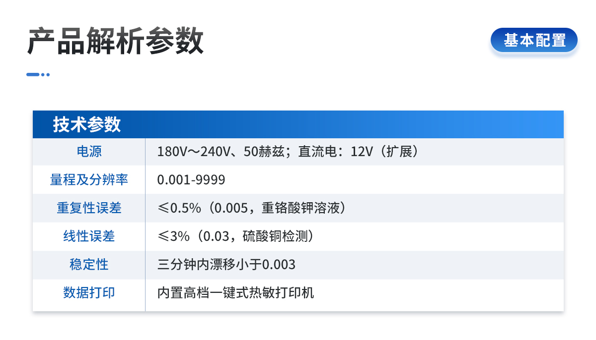 | 電源:交流電:180V~240V、50赫茲;直流電:12V(擴(kuò)展) | 量程及分辨率:0.001-9999 | 穩(wěn)定性:三分鐘內(nèi)漂移小于0.003 | 線性誤差:≤3%(0.03,硫酸銅檢測(cè)) | 重復(fù)性誤差:≤0.5%(0.005,重鉻酸鉀溶液) | 靈敏度:紅光≥4.5 ×10-5 藍(lán)光≥3.17×10-3 | 波長范圍:紅光620±8nm 藍(lán)光440±8nm | 測(cè)試速度:測(cè)一個(gè)土樣有機(jī)質(zhì)≤60分鐘(含前處理時(shí)間) | 可同時(shí)檢測(cè)8個(gè)土樣≤個(gè)小時(shí)(含前處理時(shí)間) | 數(shù)據(jù)打?。簝?nèi)置高檔一鍵式熱敏打印機(jī)(國內(nèi)首家**設(shè)計(jì)) |