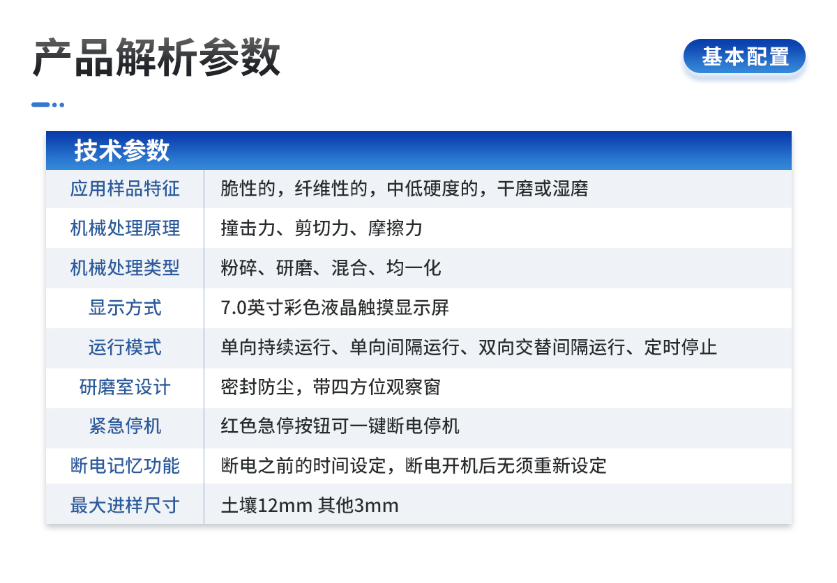 技術(shù)參數(shù): 應(yīng)用領(lǐng)域:土壤、地質(zhì)、環(huán)保、第三方檢測、農(nóng)牧業(yè)、農(nóng)產(chǎn)品質(zhì)量、資源與環(huán)境等,土壤制樣、重金屬分析 應(yīng)用樣品特征:脆性的,纖維性的,中低硬度的,干磨或濕磨 儀器機(jī)