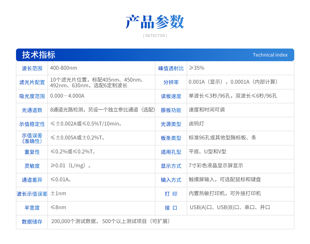 | *波長(zhǎng)范圍: 400-800nm *濾光片配置:10個(gè)濾光片位置,標(biāo)配405nm、450nm、492nm、630nm,選配6定制波長(zhǎng) 吸光度范圍:0.000―4.000A *光通道數(shù):8通道光路檢測(cè),另設(shè)一個(gè)獨(dú)立參比通道(選配) *示值穩(wěn)定性:≤±0.002A或≤0.5%T/10min *示值誤差(準(zhǔn)確性):≤±0.005A或±0.2%T *重復(fù)性:≤0.2%或≤0.2%T 靈敏度:≥0.01(L/mg) 通道差異:≤0.01A 波長(zhǎng)示值誤差:±1nm 半寬度:≤8nm 峰值透射比:≥35% 分辨率:0.001A(顯示),0.0001A(內(nèi)部計(jì)算) *讀板速度:?jiǎn)尾ㄩL(zhǎng)≤3秒/96孔,雙波長(zhǎng)≤6秒/96孔 振板功能:速度和時(shí)間可調(diào) 光源類型:鹵鎢燈 板條類型:標(biāo)準(zhǔn)96孔或其他型酶標(biāo)板、條 適用孔型:平底、U型和V型 顯示方式:7寸彩色液晶顯示屏顯示 輸入方式:觸摸屏輸入,可選配鼠標(biāo)和鍵盤 打?。簝?nèi)置熱敏打印機(jī),可外接打印機(jī) 接 口: USB(A)口、USB(B)口、串口、并口 *數(shù)據(jù)儲(chǔ)存:200,000個(gè)測(cè)試數(shù)據(jù),500個(gè)以上測(cè)試項(xiàng)目(可擴(kuò)展) 使用環(huán)境:溫度5-40℃;濕度15%-80% 電源電壓:220V±10%,50/60Hz 體積:475mm×350mm×210mm(長(zhǎng)×寬×高) 重量:11.5Kg |