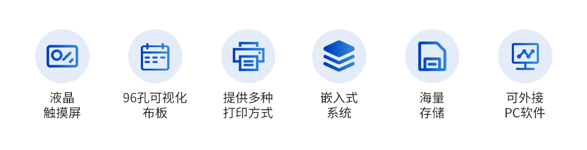 | 1. 10.4英寸彩色液晶觸摸屏輸入,大屏顯示,操作快捷。 | 2. 全屏顯示96孔可視化布板操作界面。 | 3. 自動儲存標準曲線,用戶可對標準曲線進行修正。 | 4. 內(nèi)置嵌入式系統(tǒng),無需外接電腦即可操作、存儲、打印。 | 5. 單波長和雙波長測試模式下均可進行自動調(diào)零。 | 6. 可選配外接PC軟件,網(wǎng)絡(luò)化支持,迎合數(shù)字化發(fā)展方向,可定制上傳。 | 7. 海量存在,至少可儲存100萬板(96)測試數(shù)據(jù)及500個編程項目,并支持數(shù)據(jù)備份恢復(fù)合并。 | 8. 在同一板上可進行24個不同項目并可用顯示區(qū)分的測試,并可同一板檢測定性和定量項目。 | 9. 模板功能,固定檢測工作,極大簡化操作人員工作量。 | 10. 智能計算測試結(jié)果,確保測試結(jié)果的準確有效,并可自動報警。 | 11.全新Windows彩色圖形化界面,全中文操作系統(tǒng),支持鼠標、鍵盤,支持多種輸入法。 | 12. 光源智能開關(guān),延長其壽命。 | 13. 全面完善的質(zhì)控功能,包含westguard多規(guī)則質(zhì)控,即刻法質(zhì)控等多種質(zhì)控圖及質(zhì)控參數(shù)計算,具有質(zhì)控報警功能。 | 14. 提供多種打印方式及多種形式中文報告,并可定制各式報告。 | 15. 布板和保存導(dǎo)入功能,大幅提高常用項目的測試效率。 | 16.可選擇吸光度、Cut-Off定性計算、單點定標、折線回歸、線性回歸、指數(shù)回歸、對數(shù)回歸、雙對數(shù)回歸、log-logit、冪回歸、四參數(shù)回歸、酶抑制率等計算方法。 | 17. 專用系統(tǒng)維護菜單,自動判斷儀器當前狀態(tài)及性能指標,并可打印相關(guān)數(shù)據(jù)。 |