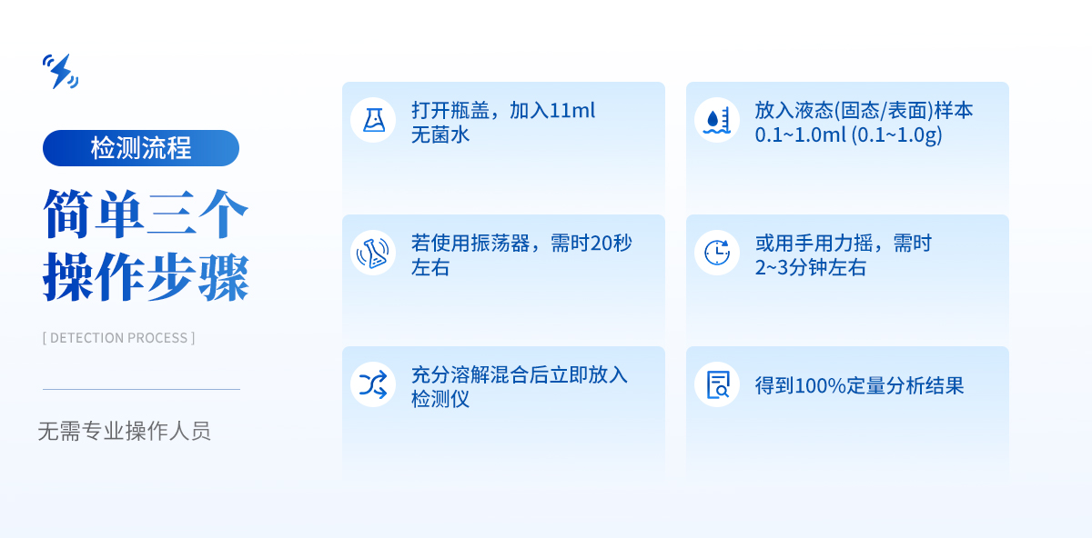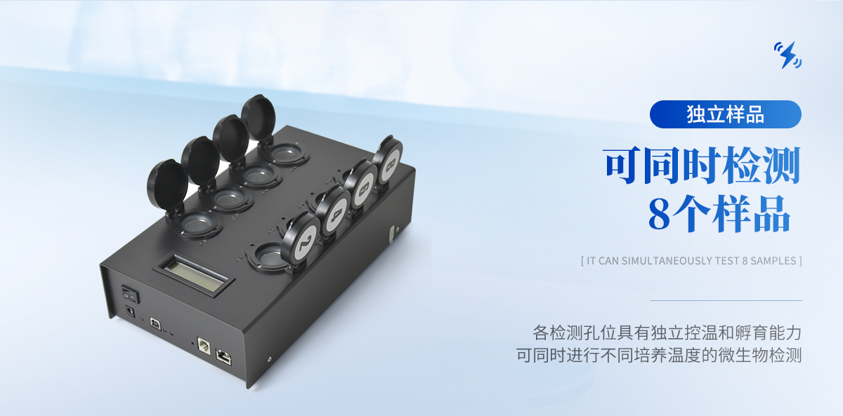 | 1) 可檢測固態(tài)、液態(tài)、表面、膏狀、漿狀樣本 | 2) 樣本在檢測時無需任何的前處理過程,直接丟入檢測瓶即可 | 3) 可自動控制孵育溫度和孵育時間 | 4) 檢測樣本只需1ml/1g;同一溫度下可同時檢測8個樣品 | 5) 靈敏度高達可檢測到1目標微生物;特異性高達99.999% | 6) 獨立、持續(xù)的檢測并記錄瓶中的微生物數(shù)量(CFU) | 7) 簡單三個操作步驟,傻瓜型,無需專業(yè)操作人員 | 8) 儀器便攜式,可隨時隨地進行檢測、100%定量分析,并可直接連接電腦出定量分析檢測報告 |
