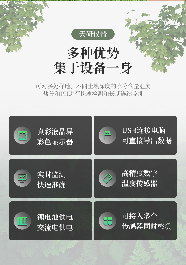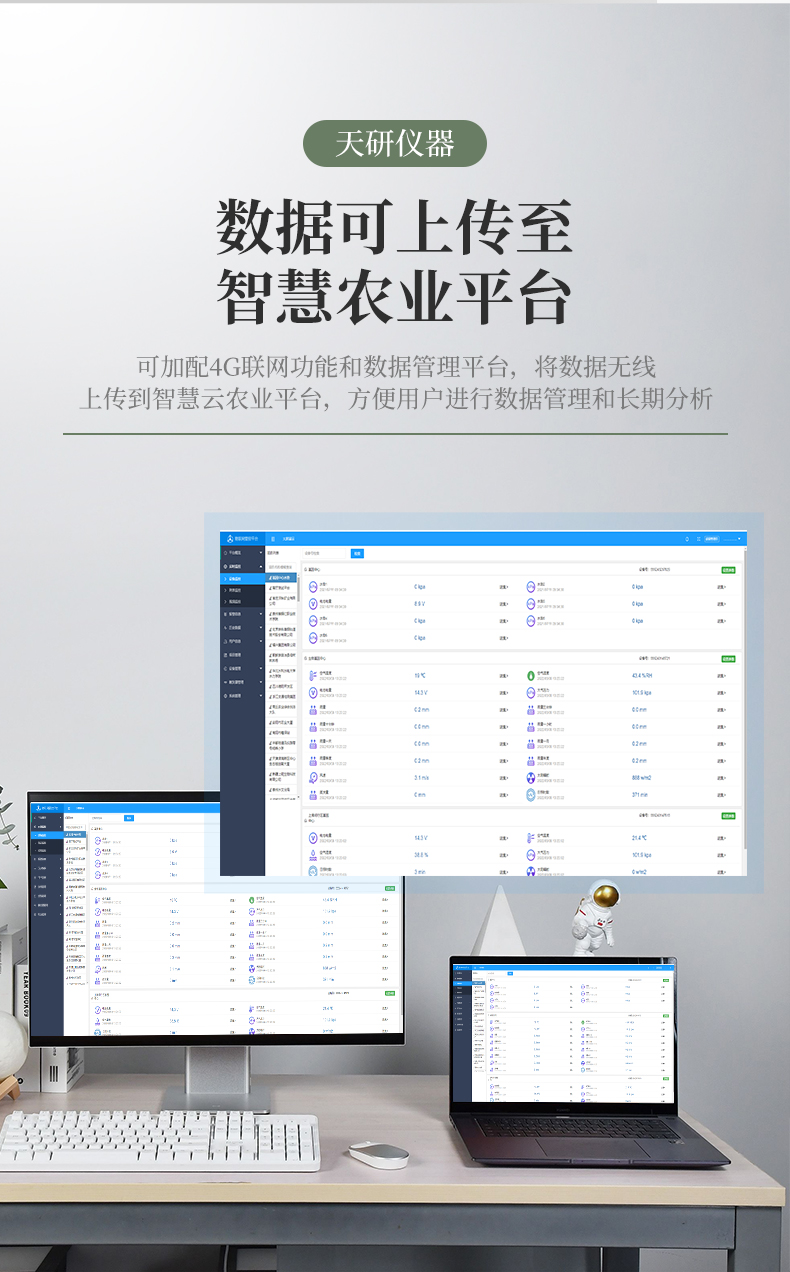 | 儀器可加配4G聯(lián)網(wǎng)功和能數(shù)據(jù)管理平臺,將本機(jī)存儲的被測點(diǎn)環(huán)境因子測量歷史數(shù)據(jù)無線上傳到智慧云農(nóng)業(yè)平臺,方便用戶進(jìn)行數(shù)據(jù)管理和長期分析。 | 本機(jī)體積小巧、美觀,操作簡單方便,性能可靠,野外攜帶極為方便。主機(jī)連接傳感器后可以手動存儲記錄也可通過主機(jī)任意設(shè)置采樣間隔,自動存儲記錄數(shù)據(jù)。 | 大屏幕彩色液晶顯示屏,全程跟蹤記錄各個(gè)被測環(huán)境因子的數(shù)值、組數(shù)、低電壓示警,主機(jī)內(nèi)置大容量存儲器,可儲存三十萬條數(shù)據(jù),具有斷電數(shù)據(jù)自動存儲保護(hù)功能。 | 各個(gè)傳感器插入主機(jī)后,主機(jī)具有自動識別功能,傳感器一致性好,可按需求自行組合傳感器,不同參數(shù)的傳感器接口可以互相轉(zhuǎn)換,對測量精度沒有影響。 | 儀器具有多通道自動檢測擴(kuò)展功能,可以實(shí)現(xiàn)多個(gè)傳感器同時(shí)接入的同步檢測。 | 上位機(jī)軟件功能強(qiáng)大,隨時(shí)可以通過USB接口將記錄中的數(shù)據(jù)導(dǎo)出到計(jì)算機(jī)上,并可以存儲為EXCE表格文件,生成數(shù)據(jù)曲線,以供其它分析軟件進(jìn)一步進(jìn)行數(shù)據(jù)處理。具有設(shè)置超限區(qū)域著色功能,超限數(shù)據(jù)變色預(yù)警,可作為環(huán)境評價(jià)的一個(gè)依據(jù)。 |