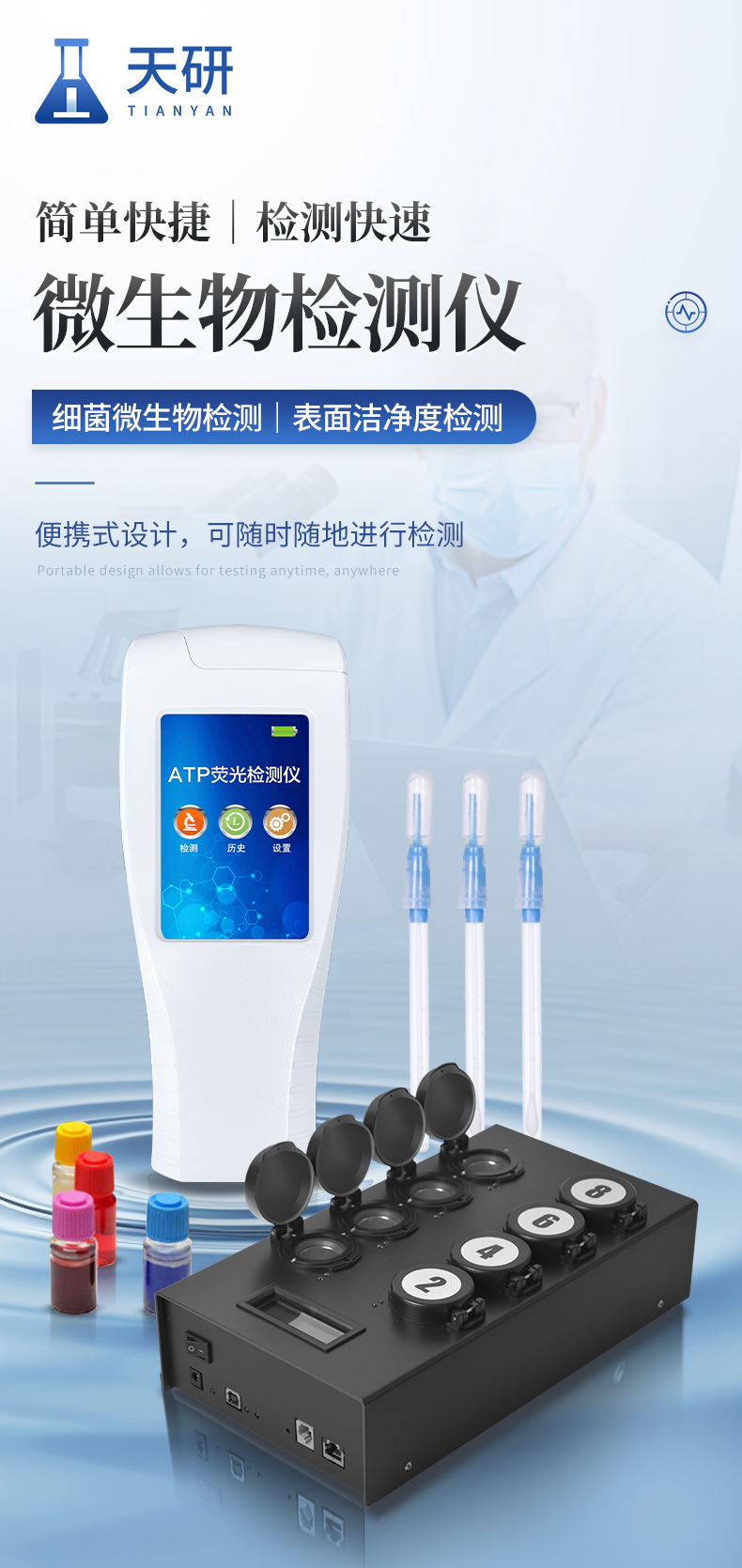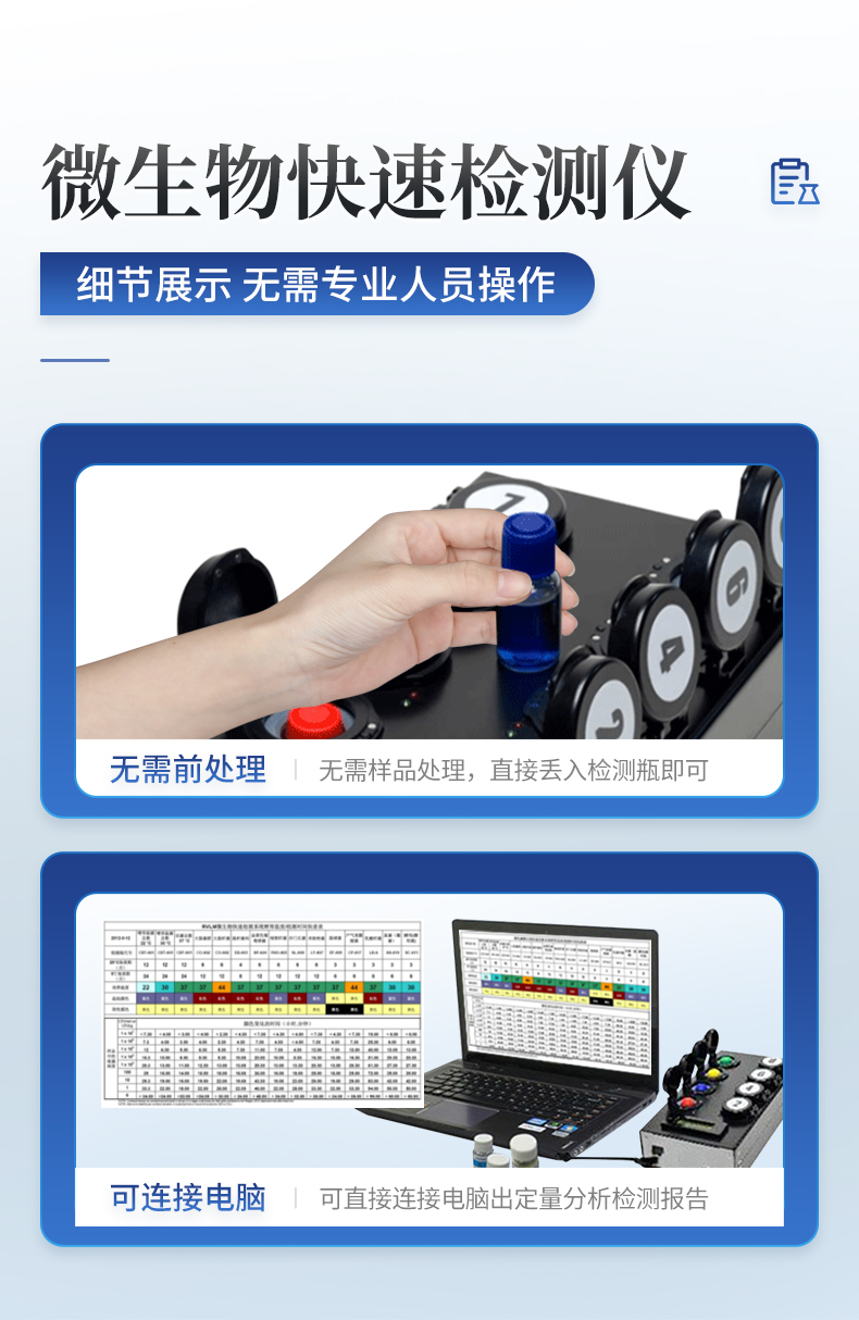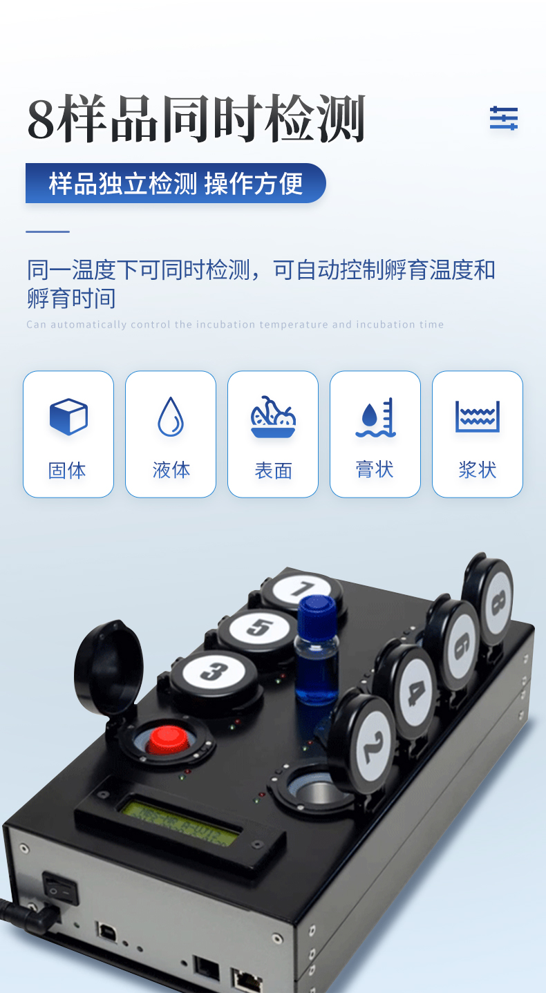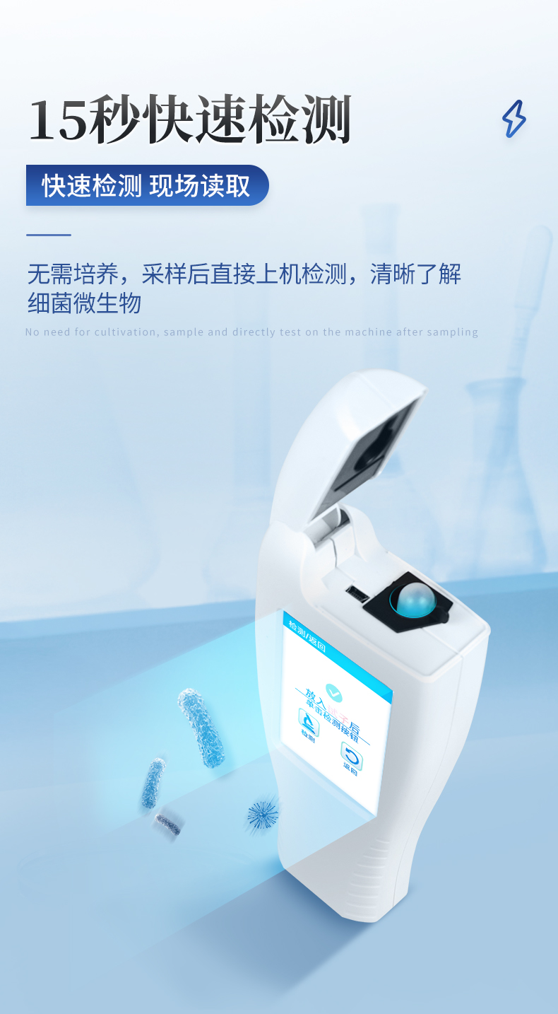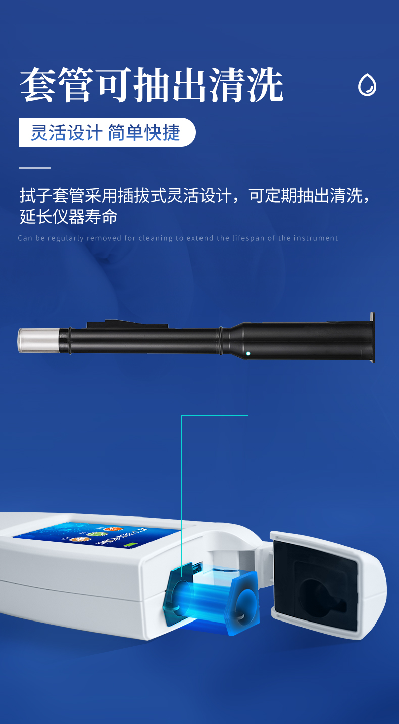 | 實(shí)用性 —— 可根據(jù)環(huán)境檢測(cè)需求設(shè)定上下限值,做到數(shù)據(jù)快速評(píng)估預(yù)警,表面潔凈度快速篩查。 | 速度快 —— 常規(guī)培養(yǎng)法18-24h以上,而ATP只需要十幾秒鐘 . | 可行性 —— 微生物數(shù)量與微生物體內(nèi)所含ATP有明確的相關(guān)性。 通過(guò)檢測(cè)ATP含量,可間接得出反應(yīng)中微生物數(shù)量 | 可操作性 —— 傳統(tǒng)培養(yǎng)方法需要在實(shí)驗(yàn)室由經(jīng)過(guò)培訓(xùn)的技術(shù)人員進(jìn)行操作;而ATP快速潔凈度檢測(cè)操作非常簡(jiǎn)便,只需簡(jiǎn)單的培訓(xùn)即可由一般工作人員進(jìn)行現(xiàn)場(chǎng)操作。 | 體驗(yàn)更好 —— 試子套管采用插拔式靈活設(shè)計(jì),可定期清洗長(zhǎng)期使用,延長(zhǎng)儀器壽命。 |