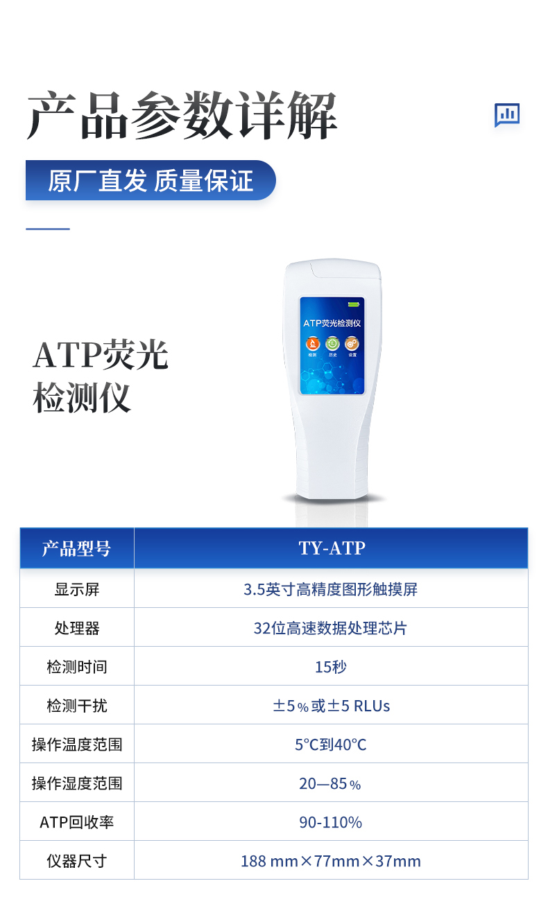 產(chǎn)品簡(jiǎn)介:該設(shè)備為全新升級(jí)產(chǎn)品,大屏幕觸摸顯示屏,代替?zhèn)鹘y(tǒng)按鍵。操作采用生物化學(xué)反應(yīng)方法檢測(cè)ATP含量,ATP熒光檢測(cè)儀基于螢火蟲發(fā)光原理,利用“熒光素酶—熒光素體系”快速檢測(cè)三磷酸腺苷(ATP)。ATP拭子含有可以裂解細(xì)胞膜的試劑,能將細(xì)胞內(nèi)ATP釋放出來(lái),與試劑中含有的特異性酶發(fā)生反應(yīng),產(chǎn)生光,再用熒光照度計(jì)檢測(cè)